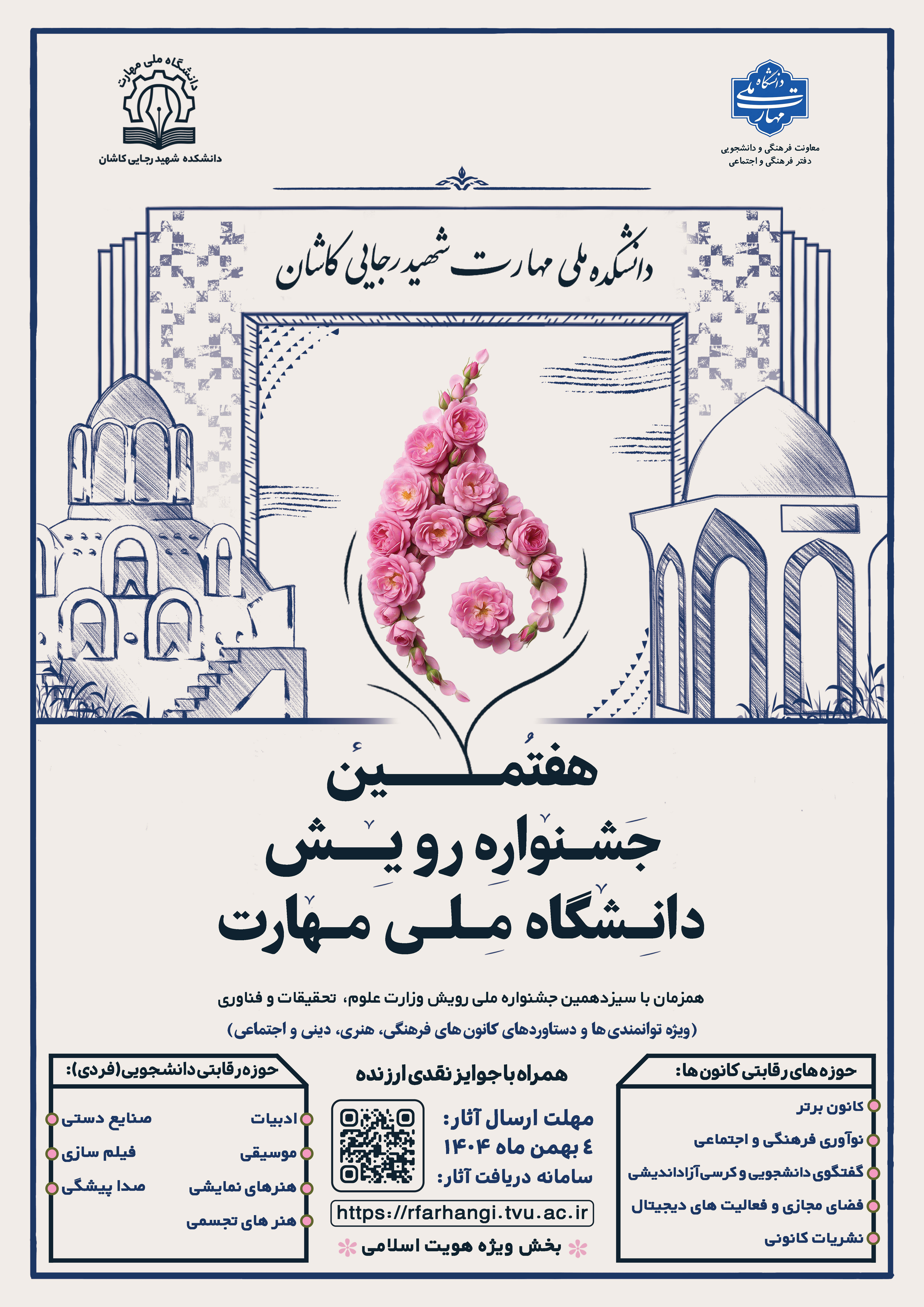 ضمن آرزوی توفیق روزافزون، با عنایت به انتخاب دانشکده شهید رجایی کاشان به عنوان ستاد اجرایی هفتمین جشنواره رویش دانشگاه ملی مهارت (ویژه دستاوردهای کانونهای فرهنگی، هنری، دینی و اجتماعی) و همزمان با سیزدهمین جشنواره ملی رویش وزارت علوم، تحقیقات و فناوری، به پیوست دستورالعمل، پوستر و اسلایدر جشنواره ارسال