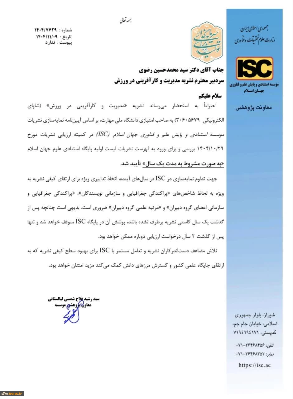 امتیاز دهید : اعضای هیات علمی محترم آی اس سی مجله مدیریت و کارآفرینی در ورزش تایید شد 2 دوشنبه 13 بهمن 1404 ساعت 8:16